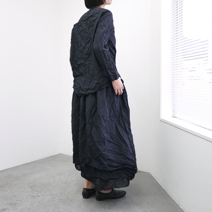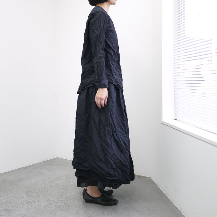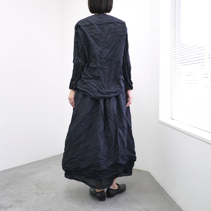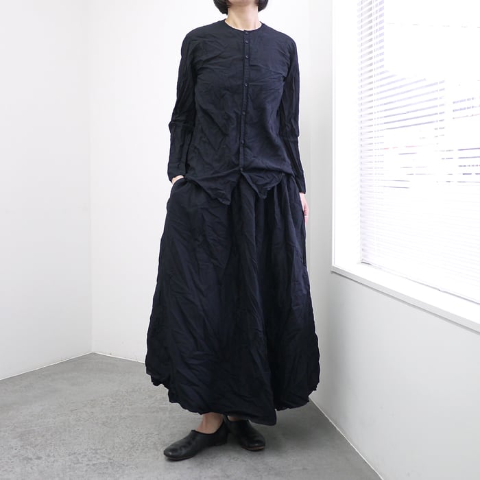 製品染めならではの独特なシワ感やニュアンスのある色合いが、日常の装いにさりげない奥行きを与えてくれる一着です。