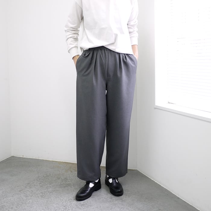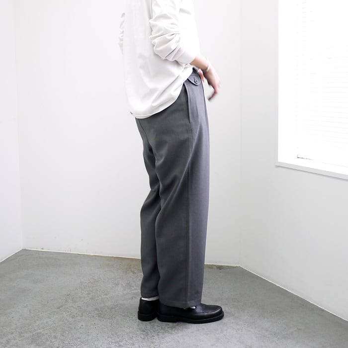 トロピカルウールのような風合いを再現したポリエステルメランジツイルを採用したワイドトラウザーズ。奥行きのある杢調の表情が清涼感を漂わせ、天然繊維のようなナチュラルな質感でありながら、ドライでさらりとした肌触りが持続します。