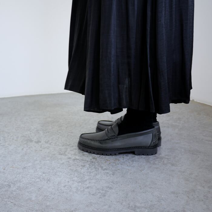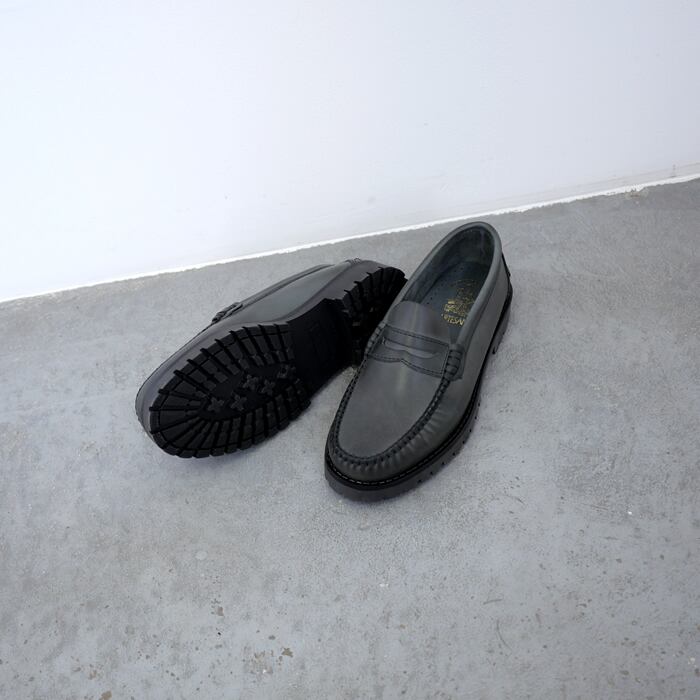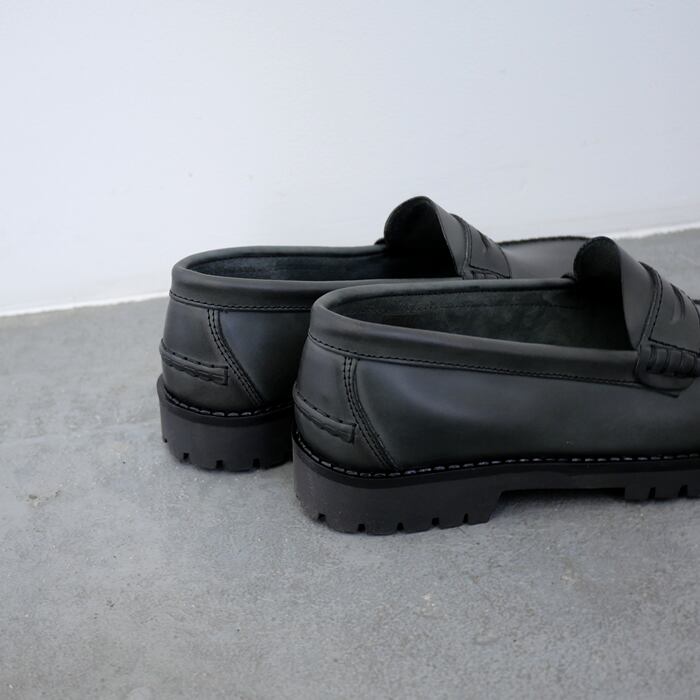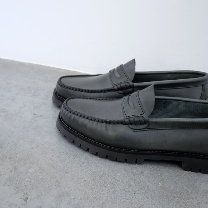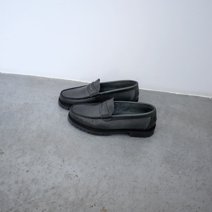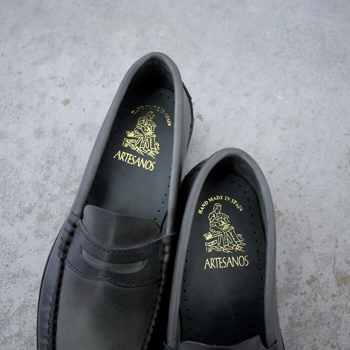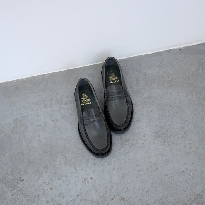 ブランド名に「職人」を意味する、アルテサノスという言葉を冠する、ARTESANOS。一足一足ハンドメイドで丁寧に作り上げられるシューズブランドです。こちらは、アッパーに履きなじみのよい牛革を使用したコインローファー。甲を深くまで覆うデザインでしっかりとフィット感あり、履きやすいデザインです。色味は上品で印象的なグレー味の強いブラックで、クラシカルな印象を演出します。