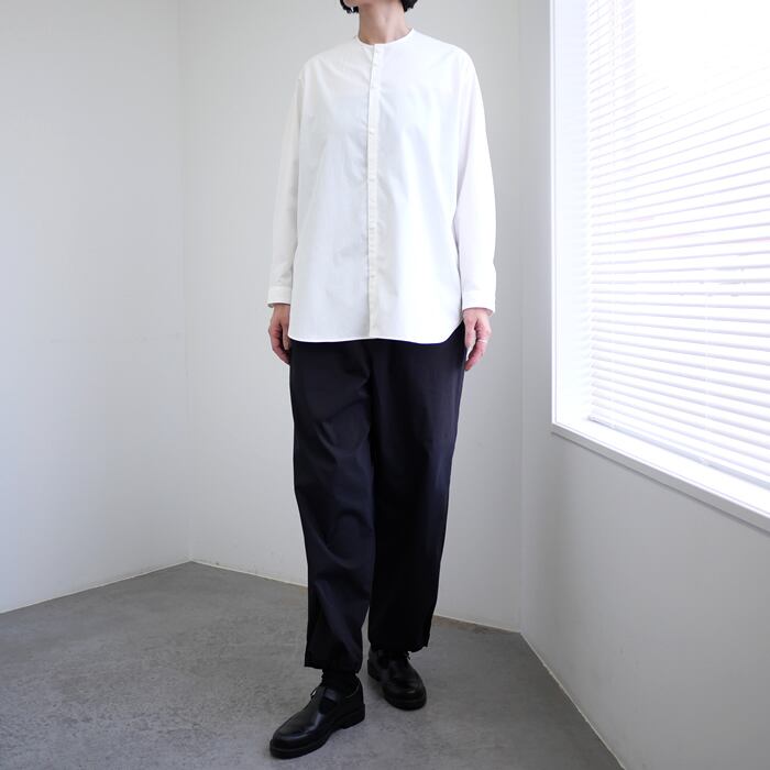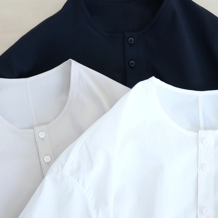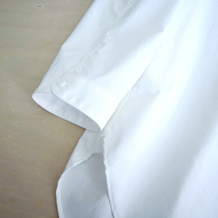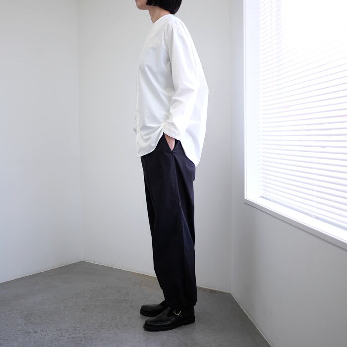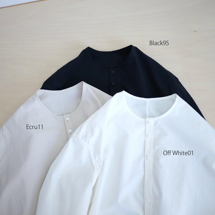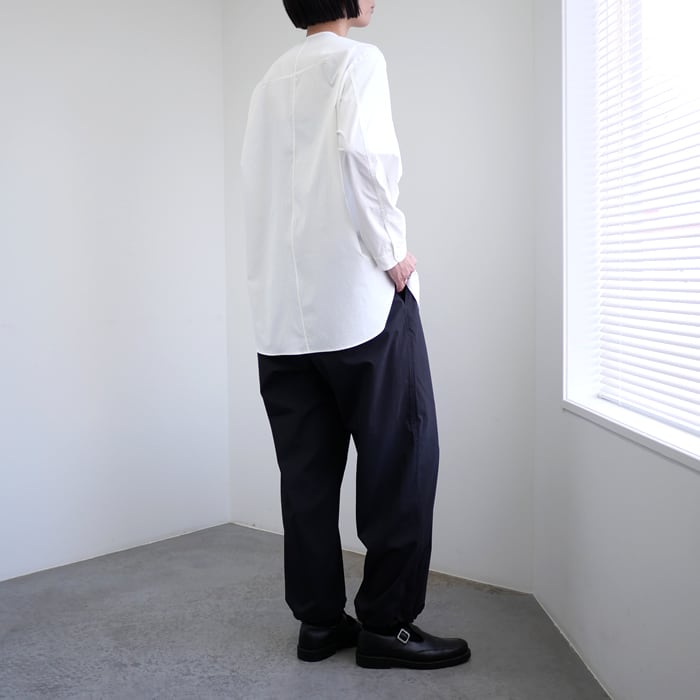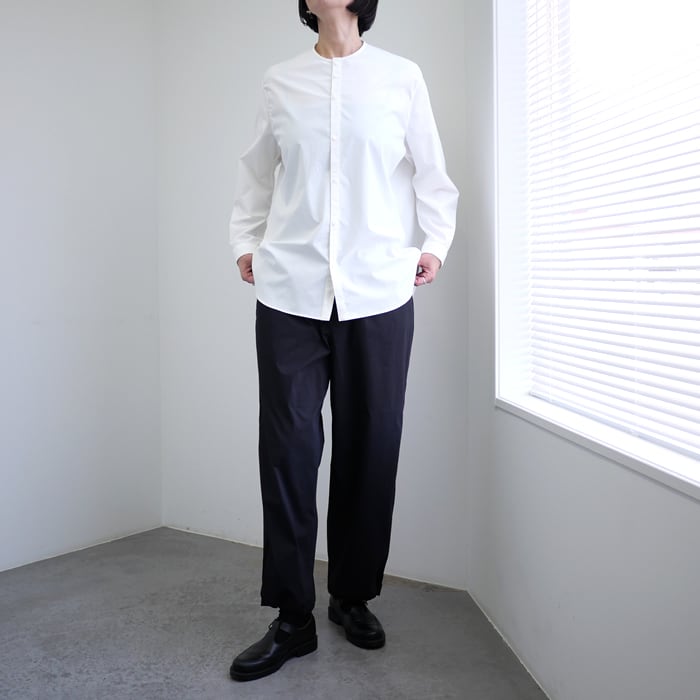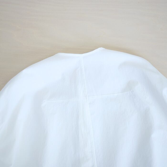 マットで光沢のないストレッチ性のあるポリエステル糸を使用した平織りタイプライター地を使用したノーカラーシャツ。ミニマルなノーカラーデザインに、運動量を確保する機能的なディティールを凝縮。シルエットの要となるのは、肩周りをすっきりと見せるジャストな肩幅。そこに、アウトドアやスポーツウェアにも用いられるピボットスリーブと脇下のガゼットを組み合わせることで、腕の上げ下げが驚くほどスムーズな、ストレスフリーの着心地を実現しました。