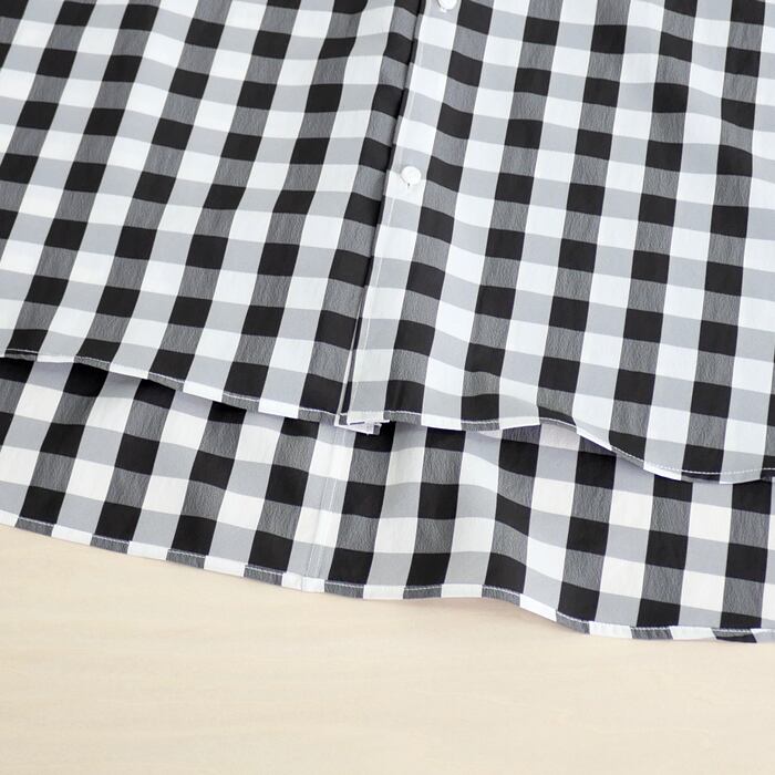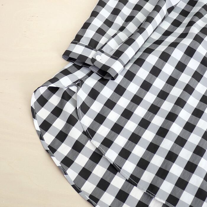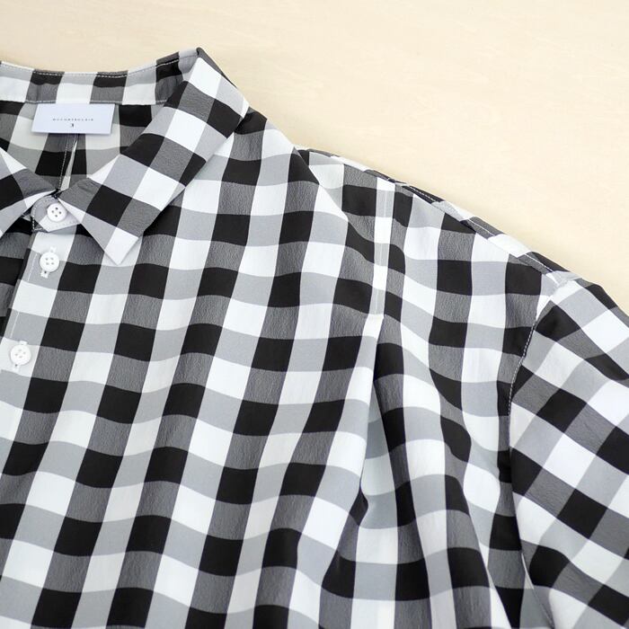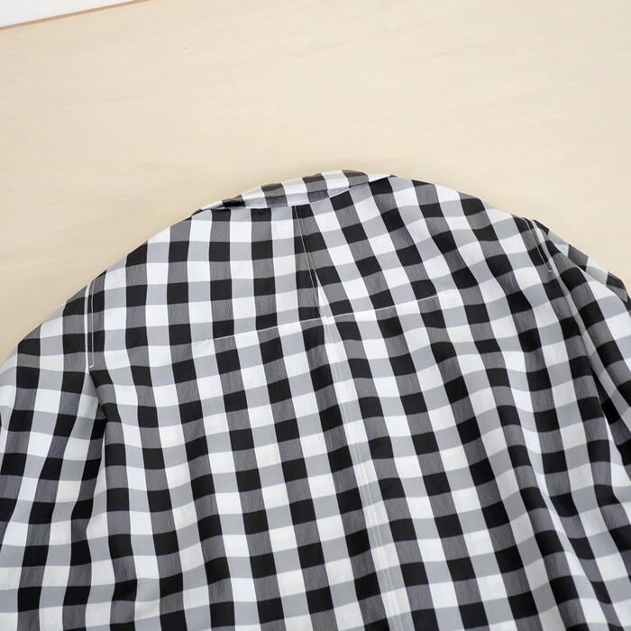 素材には、ポリエステル100%のサッカーチェックを使用。糸の収縮差で生み出された軽やかな凹凸感は、肌への接触面積を減らし、常にドライでクリアな着心地を保ちます。また、シワを気にせずお洗濯できるイージーケア仕様も、日常使いには嬉しいポイントです。扱いやすさとデザイン性を両立した一着。