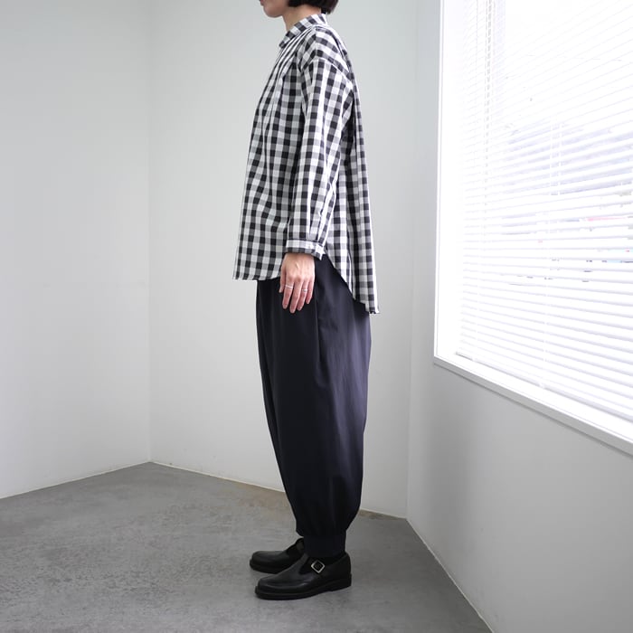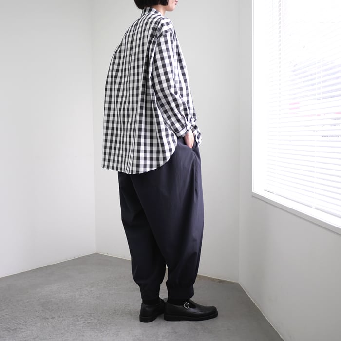 最大の特徴は、商品名にもなっている肩のタックデザイン。このディティールがオーバーサイズなシルエットに立体的な表情を与え、シンプルながらも一枚で主役級の存在感を放ちます。台襟付きのシャツカラーが顔周りを端正に引き締め、カジュアルな中にも凛とした気品を漂わせます。裾は柔らかな印象のラウンドヘムを採用し、後裾を少し長く設定。サイドの脇ガゼットなど、ヴィンテージシャツのような本格的なディティールを盛り込みつつ、現代的なバランスへと昇華させています。