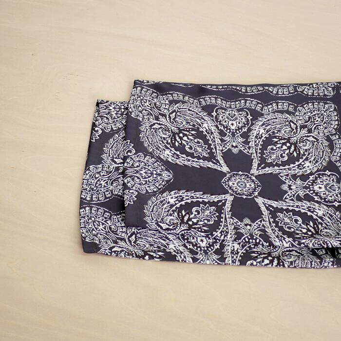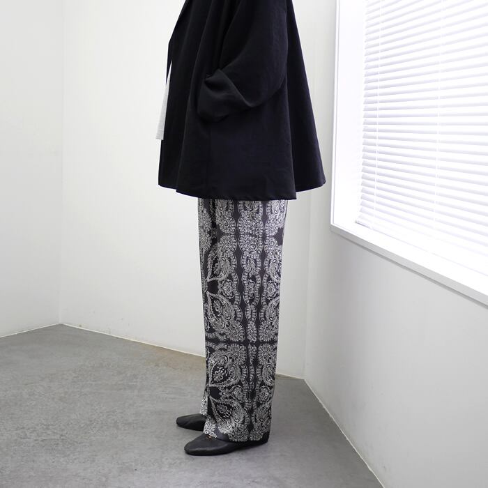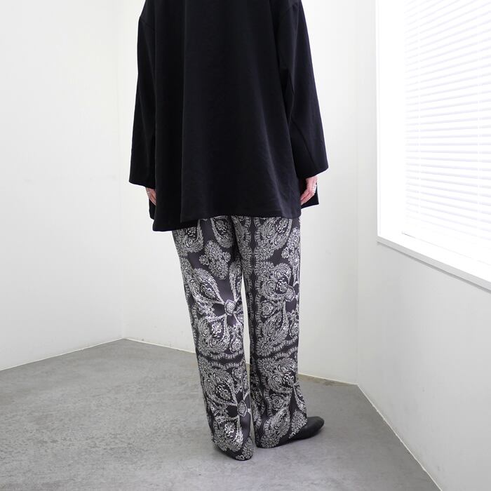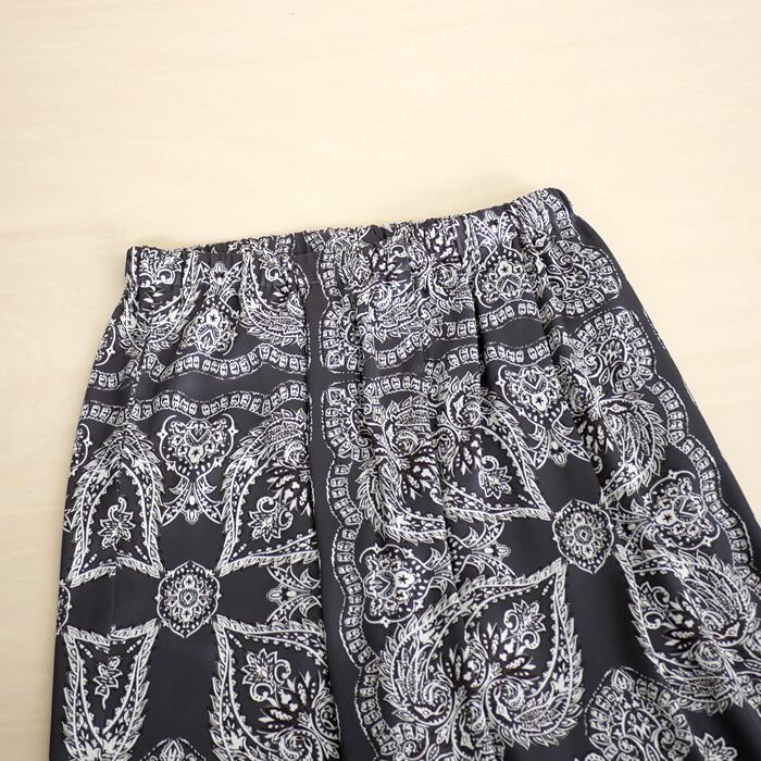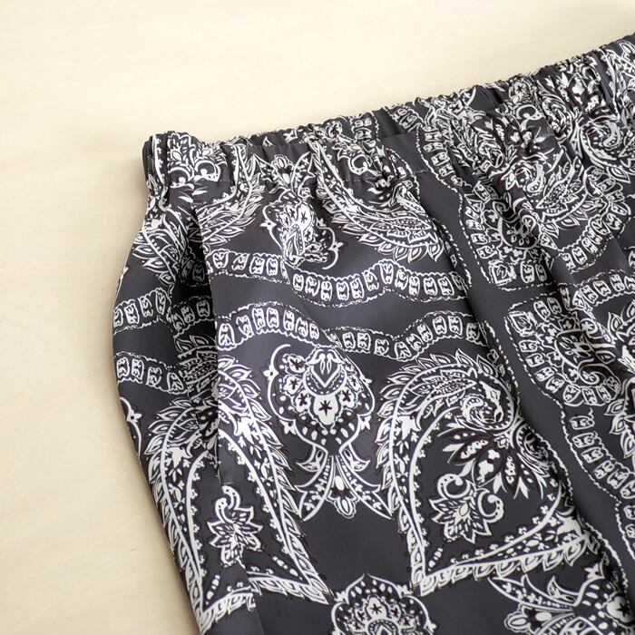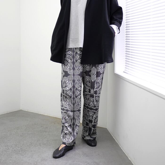 クラシックなバンダナ柄を全面にあしらった、存在感溢れるストレートイージーパンツです。目を引く総柄デザインでありながら、計算されたストレートシルエットによって醸し出される大人の余裕。ゆったりとしたリラクシーな穿き心地を保ちながらも、ルーズになりすぎない端正なラインが、コーディネートに程よいスパイスを加えてくれます。