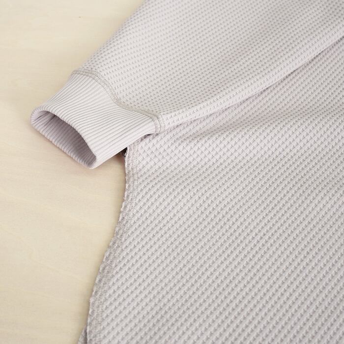 素材の核となるのは、バイメタル構造のストレッチ糸を用いた次世代のワッフル組織。糸そのものがバネのような構造を持つことで、驚異的な伸縮性と、形崩れを防ぐ優れた伸長回復率を両立しました。ワッフル特有の凹凸は、肌への接触面を最小限に抑える「点接着」となり、汗をかいてもベタつきにくく、シワも寄せ付けないクリーンな状態を保ちます。