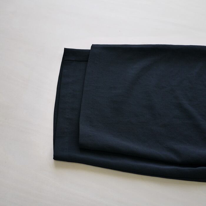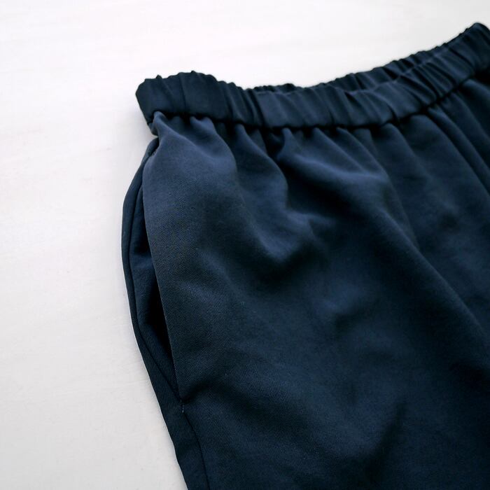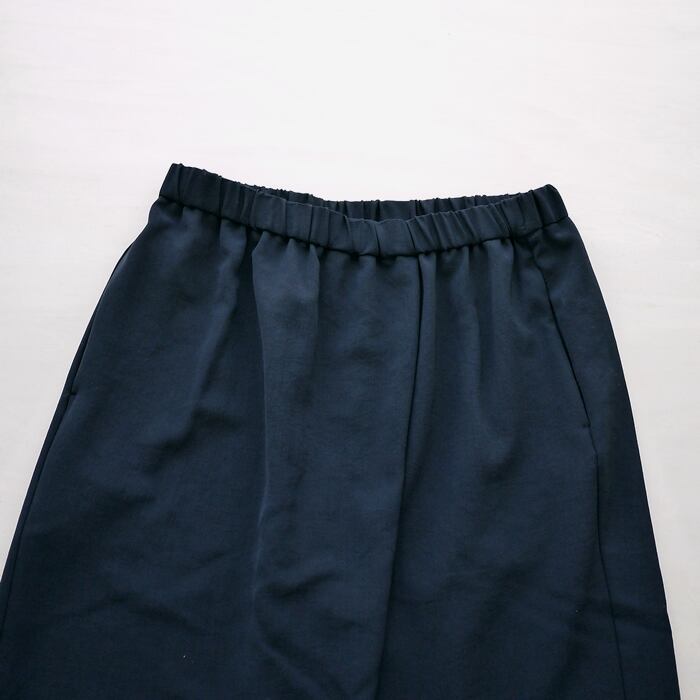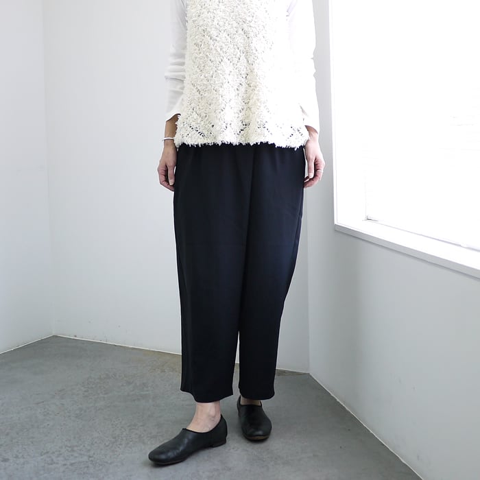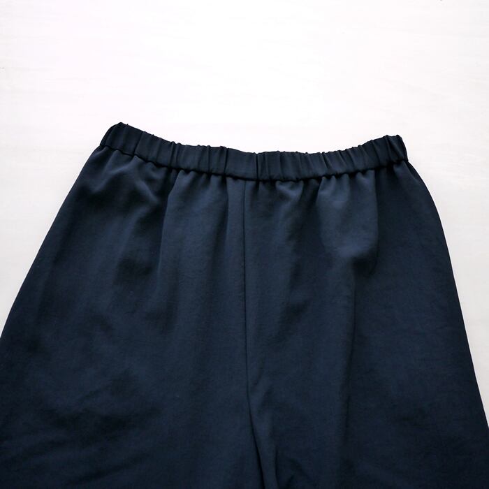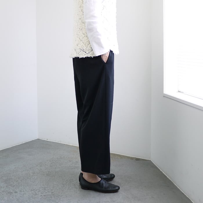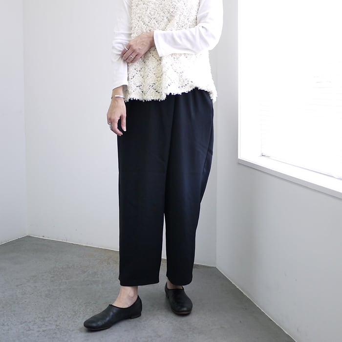 最大の特徴は、計算されたワイド&ルーズなシルエットが生み出す、歩くたびに揺れるしなやかな落ち感。一見スカートのようにも見えるフレアなラインが、着こなしに奥行きとリズムを与えます。フルレングス設計でありながら、ウエストは全ゴム仕様でリラックスした穿き心地。腰の位置で穿きこなすことで、その日のシューズに合わせた絶妙な丈感の調節も可能です。