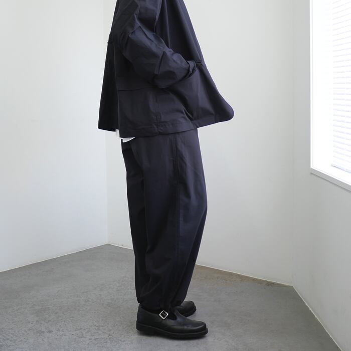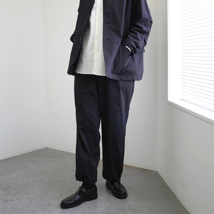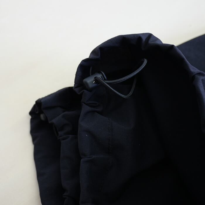 デザインの核となるのは、クラシックな佇まいを崩さずに盛り込まれたスポーティーなディテール。ウエストと裾にはドローコードを完備し、ベルトレスでの着用や、裾の絞り具合によるシルエットの変化を自由自在に楽しめます。