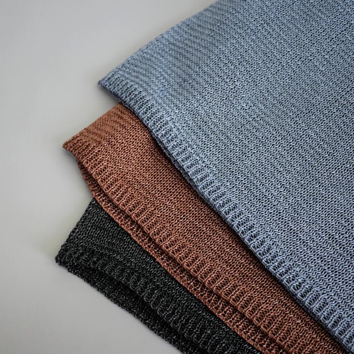 最大の特徴は、テープヤーンで編み上げたリネンライクな質感です。独特のシャリ感と凹凸のある表情が、春夏の装いにナチュラルで洗練されたニュアンスをプラス。通気性に優れ、重ね着をしても重たくならず、清々しい着心地をキープします。