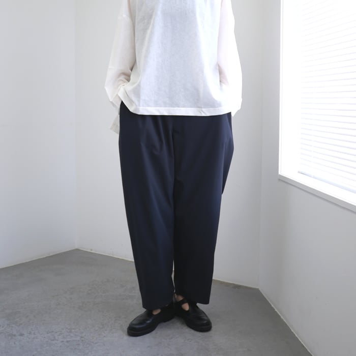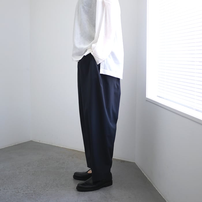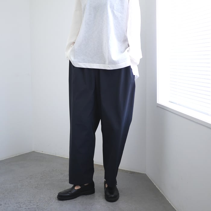 最大の特徴は、もも周りに大胆なボリュームを持たせたワイドテーパードシルエット。脇のタックの奥に前後ポケットを忍ばせるなど、機能的なディテールを造形の一部として溶け込ませた、遊び心とモードな空気が同居するデザインです。裾に向かって緩やかに絞りを入れることで、ボリュームがありながらも足元はすっきりと、現代的なバランスに仕上げられています。