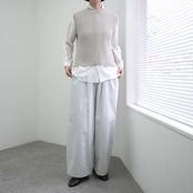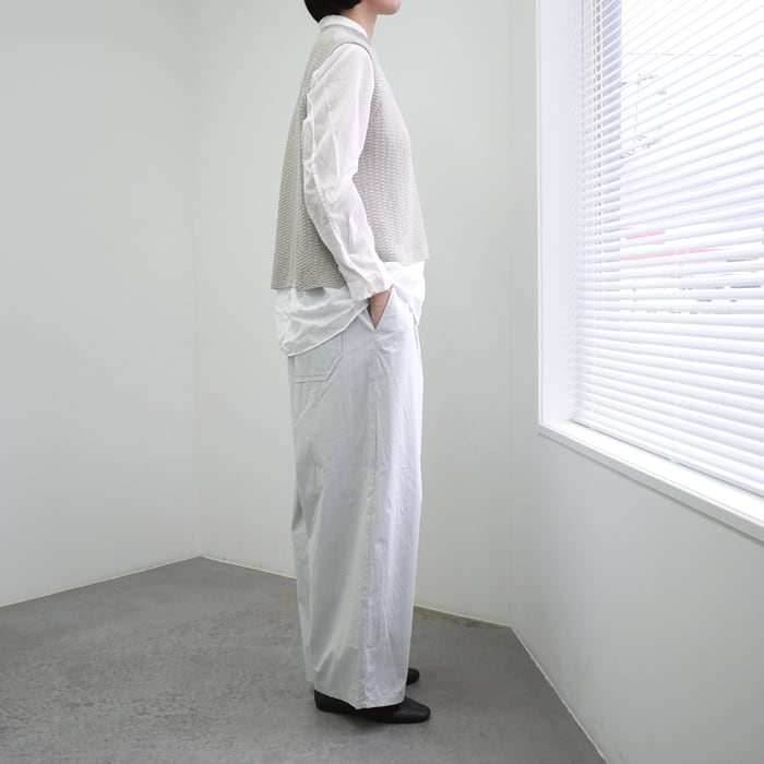 熟練の技術を感じさせる繊細な柄編み(パターンニット)が特徴。立体的な編み地が、ワントーンのシンプルな佇まいの中に奥行きと確かな存在感を生み出しています。コットンリネン特有のシャリ感と柔らかさを兼ね備えた素材は、驚くほど軽やか。通気性に優れているため、季節の変わり目から本格的な夏まで、常に心地よい体温を保ってくれます。