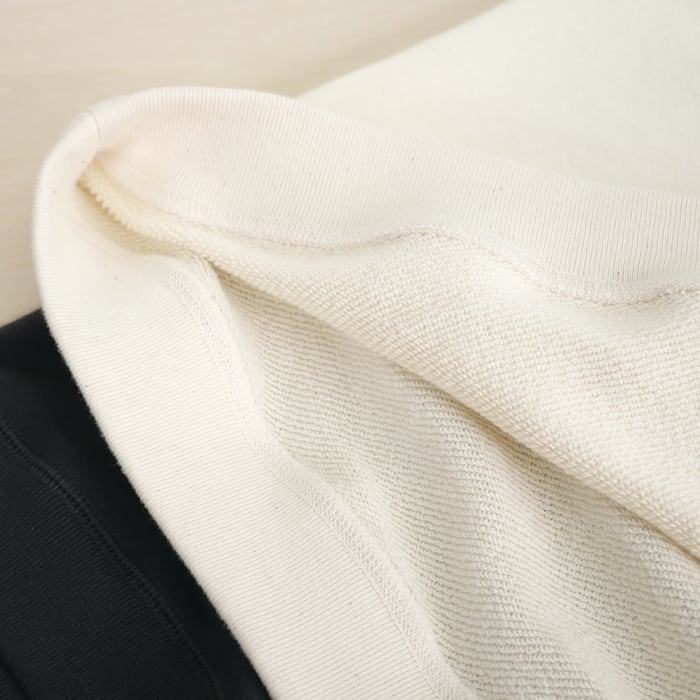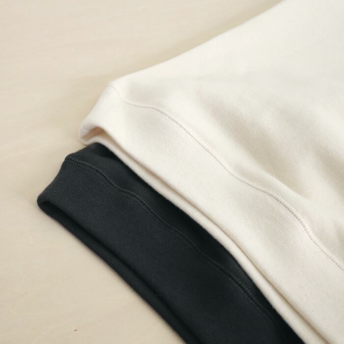スウェット特有のふんわりとした肌触りと、程よい厚みが生む安心感のある着心地が特徴。ループ状に編まれた裏毛が素肌に優しく馴染み、吸湿性にも優れているため、汗ばむ季節でもさらりと快適に過ごせます。