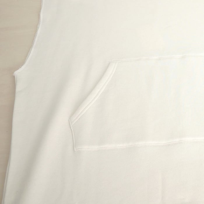 フロントには、デザインのアクセントにもなる愛らしいカンガルーポケットを配置。カジュアルな遊び心をプラスしつつ、実用性も兼ね備えています。袖のないスリーブレスのデザインは、肩回りをすっきりと見せ、一枚での着用はもちろん、カーディガンやシャツを羽織ったレイヤードスタイルも軽やかに決まります。