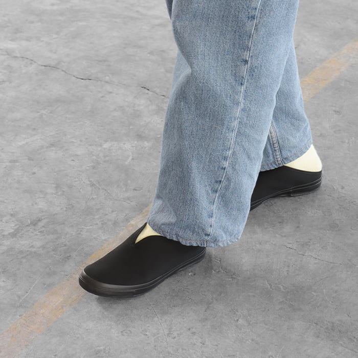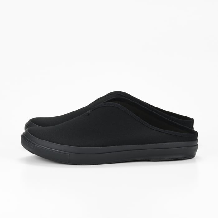 V字に開いたスリットは、デザインとして美しいだけでなく、足の甲をすっきりと見せ、脚長な視覚効果をもたらします。ミュールタイプならではの軽快な着脱性はそのままに、端正な佇まいがカジュアルな装いをクラスアップさせ、モードなスタイリングにも静かに寄り添います。