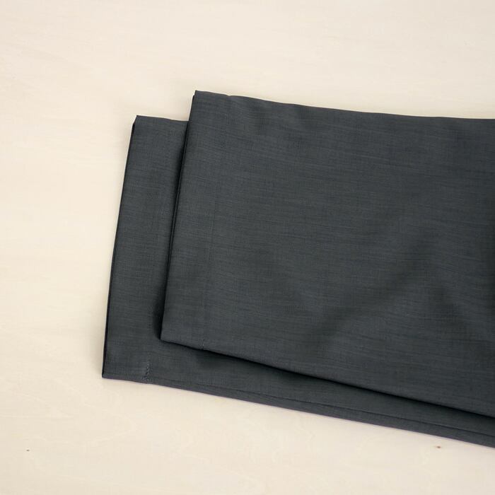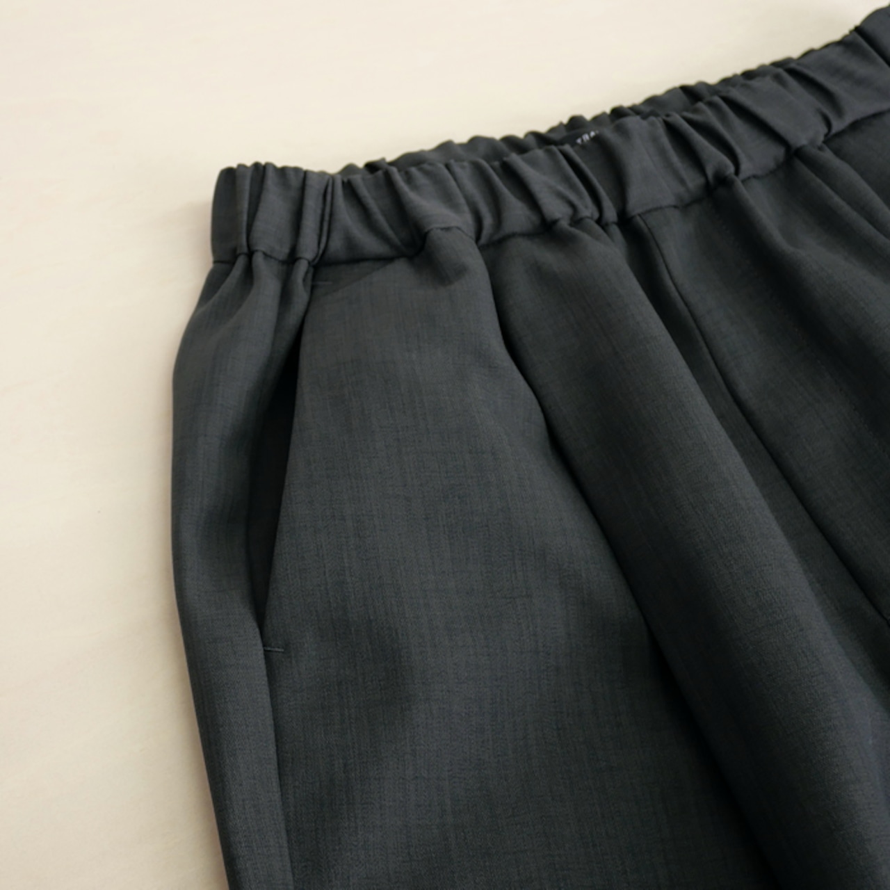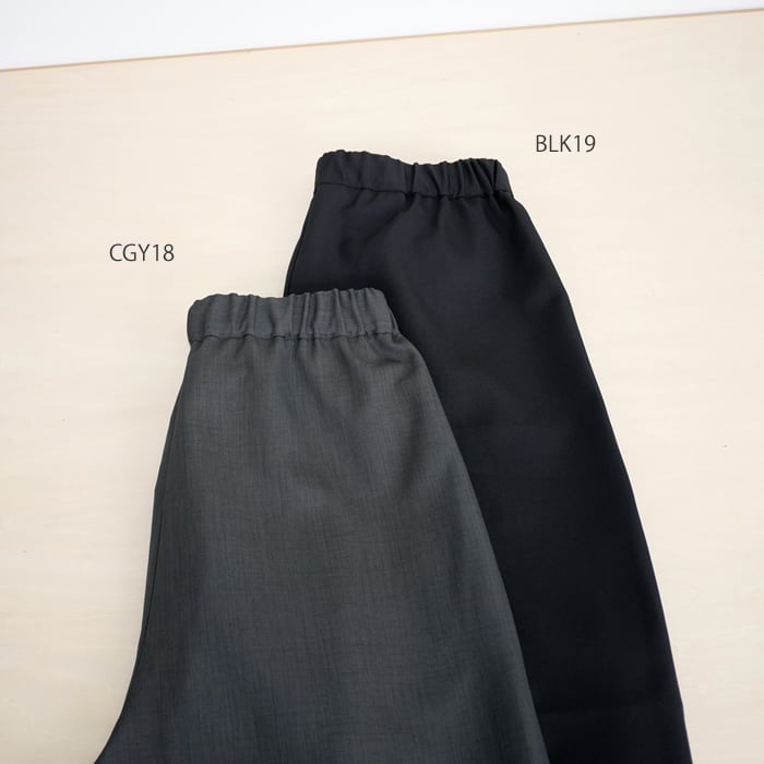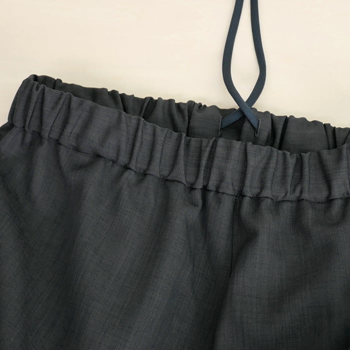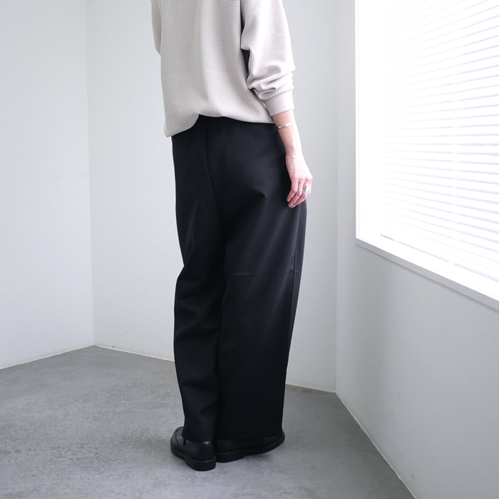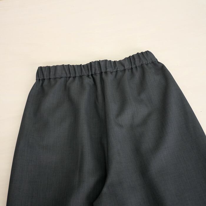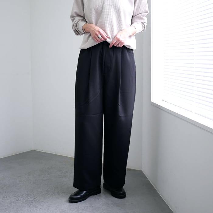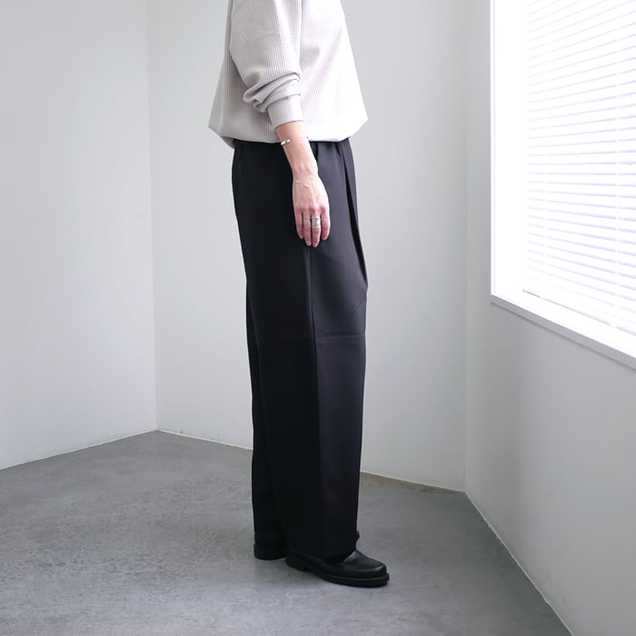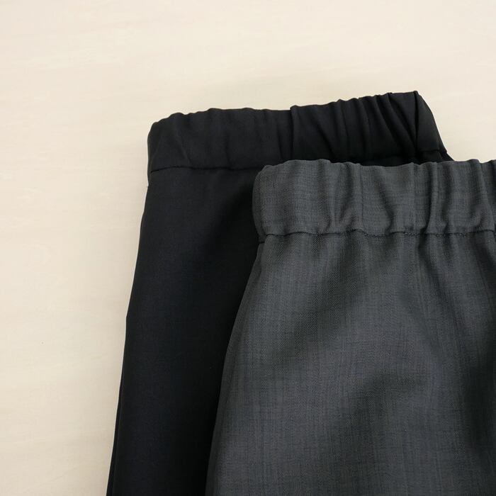 特徴は、ウーステッドならではの上品な光沢感となめらかな肌触りです。毛羽立ちを抑えたクリーンな質感は、一目で質の良さが伝わる凛とした表情。この上質な素材を、あえてゆとりを持たせたワイドめのシルエットに落とし込むことで、脚のラインを拾わず、今の空気を纏った大人の余裕を感じさせる佇まいに仕上げました。