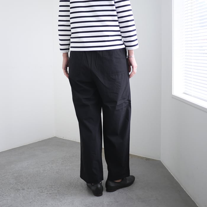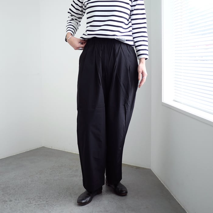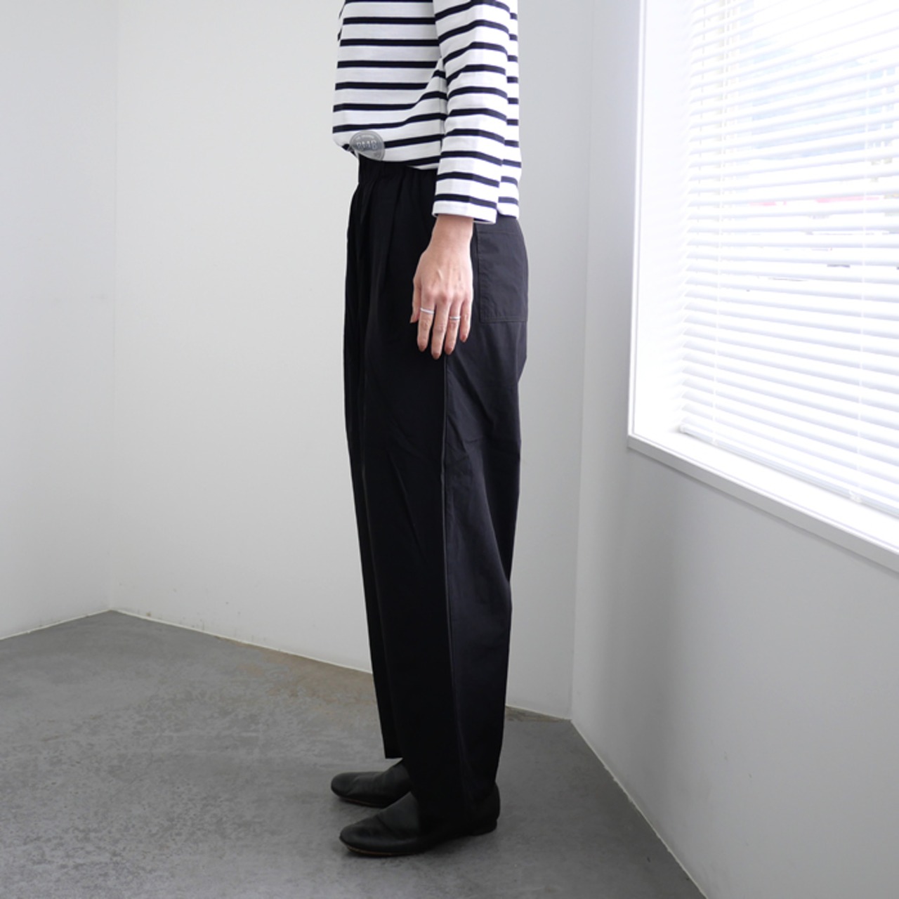 特徴は、フロントに施された2タックのデザイン。腰回りに心地よいゆとりを生み出しつつ、そこから裾に向かって流れるようなワイドシルエットが、装いにモダンなリズムをプラス。身体のラインを拾いすぎないため、どんな体型の方でもリラックスしてスマートに穿きこなせます。