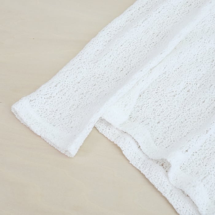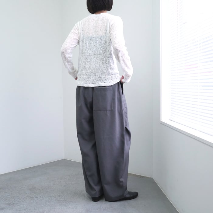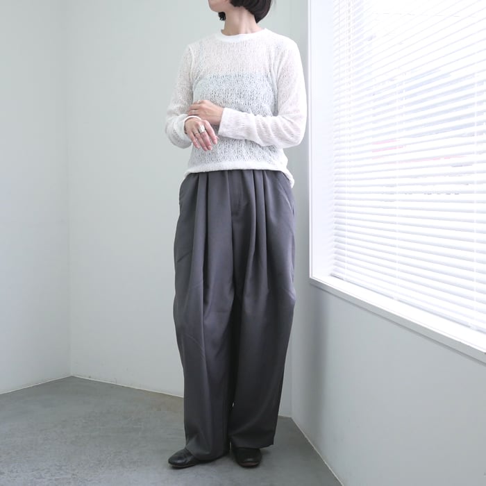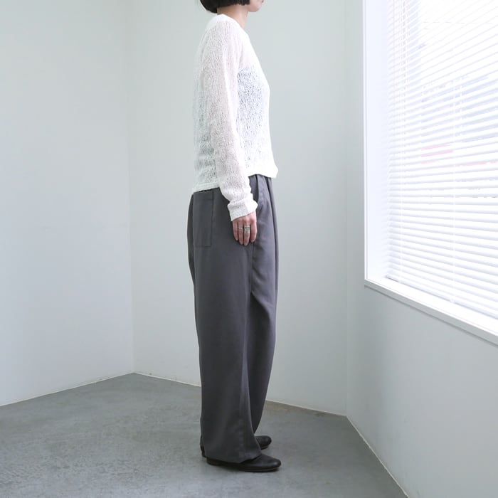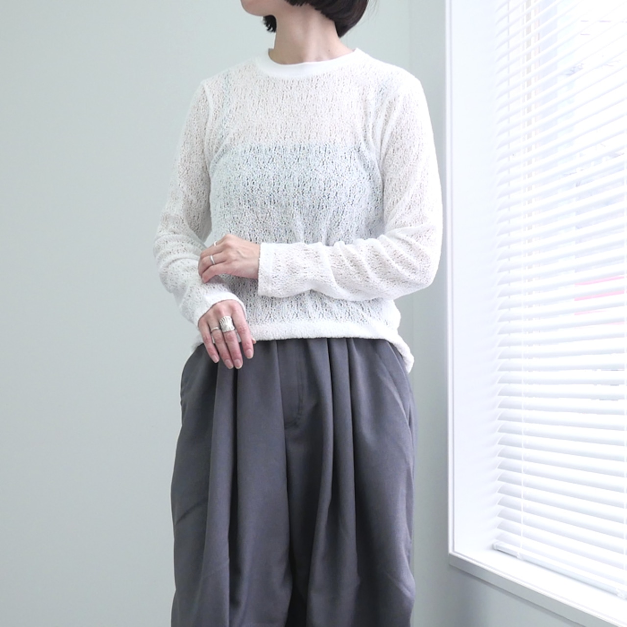 シルエット自体は極めてシンプルに設計されているため、合わせるアイテムを選ばない汎用性の高さも魅力の一つ。デニムでラフに外しても、スラックスで綺麗めにまとめても、レースの立体感が着こなしに奥行きを与えてくれます。