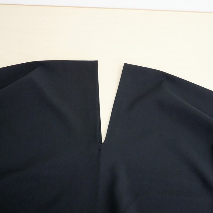 人が袖を通すことで、素材そのものが持つ特性が自然なしわやよれとなって表れ、この生地ならではの個性的な表情を形作るのが特徴的です。計算された平面が、立体的な身体と出会うことで生まれる唯一無二のシルエットは、まさに纏うオブジェのような存在感を放ちます。