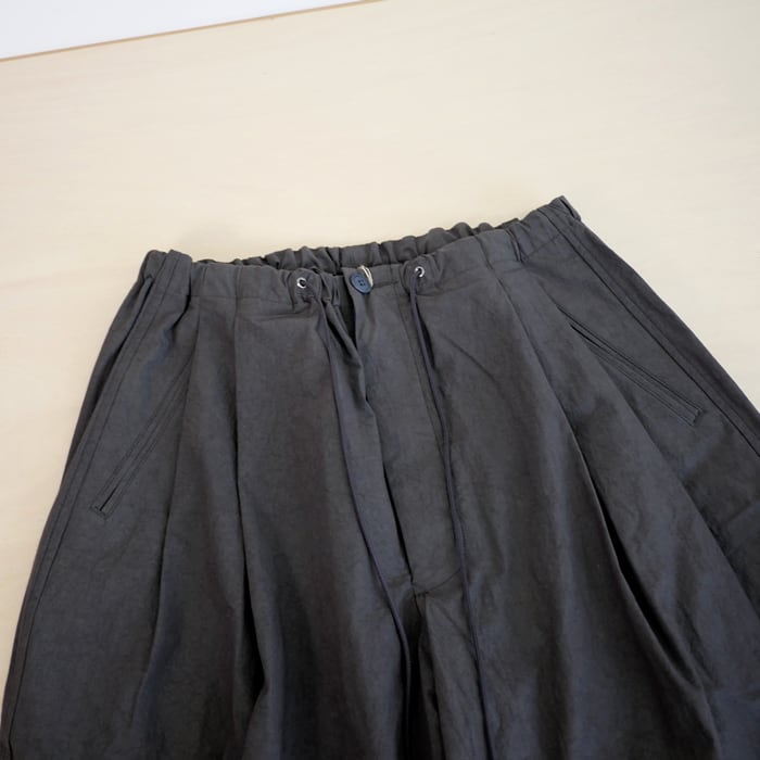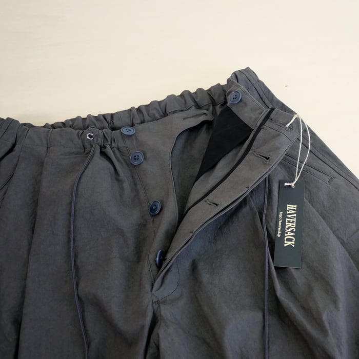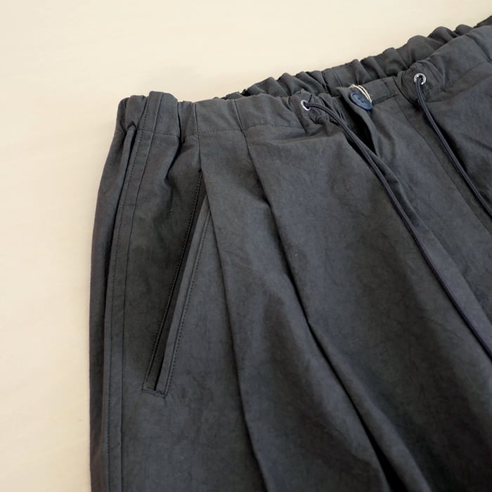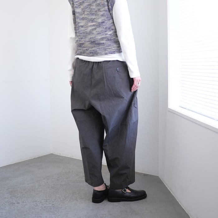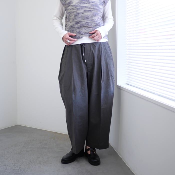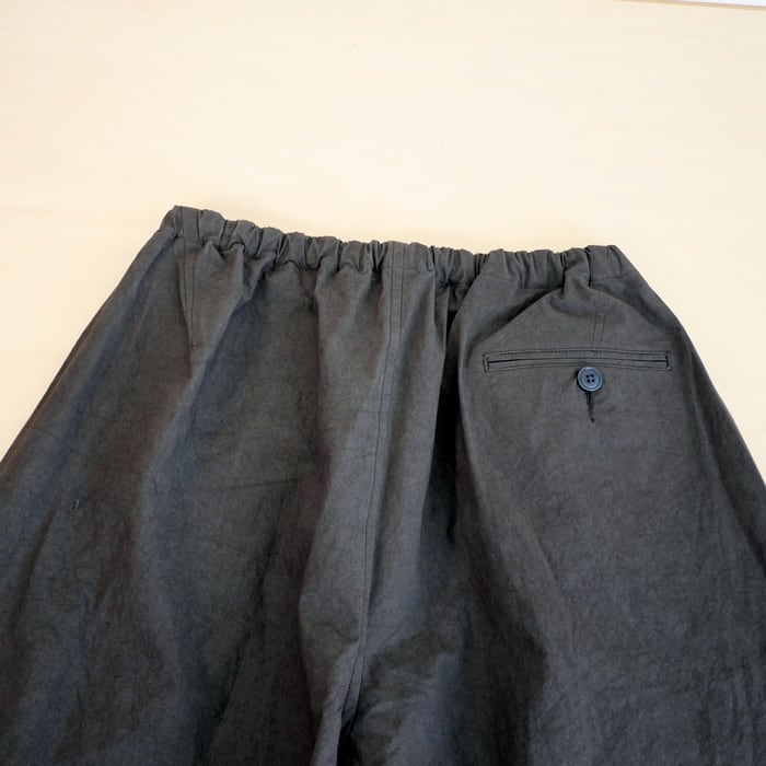 ウエストは、スピンドルを通したゴムシャーリング仕様。リラックスした穿き心地でありながら、タックインした際にも様になる端正なルックスを両立しています。