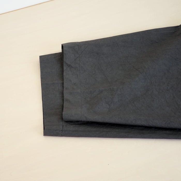 素材には、職人の手によって丁寧に染め上げられた40タイプライター地を採用。天日干しならではの自然なシワ感と、手染めによる絶妙なムラ感が重なり合い、新品でありながらも長年愛用してきたような、奥行きのある風合いを湛えています。高密度に織られた生地の軽やかさとハリ感は、ワイドシルエットを美しく保つという良さも備えています。