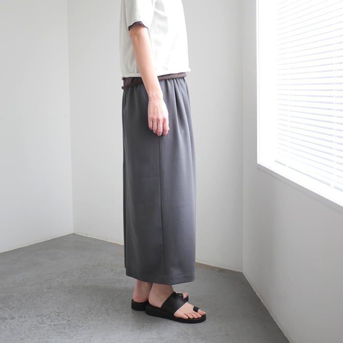 シーズンを問わず手に取れる軽やかさと、シワになりにくいポリエステル素材の利便性。日常の動作に合わせてプリーツが静かに広がり、素材の持つ繊細な陰影が引き立つ、大人のためのスタンダードなスカートです。
