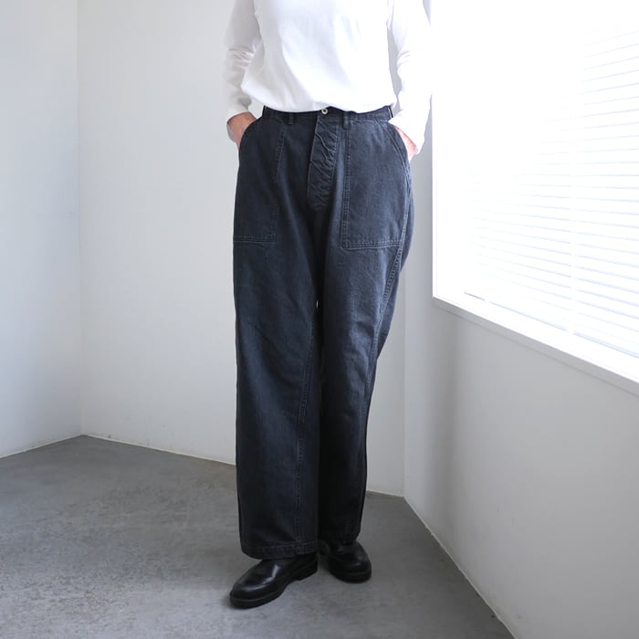 デザインは、大きなパッチポケットが目を引く本格的なベイカーパンツ仕様。無骨なミリタリーのディテールをベースにしながらも、スビンコットン特有の上質な光沢感が、ブラックデニムの深い色合いと重なり、どこか都会的で洗練された佇まいに仕上げています。