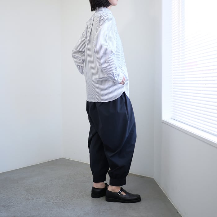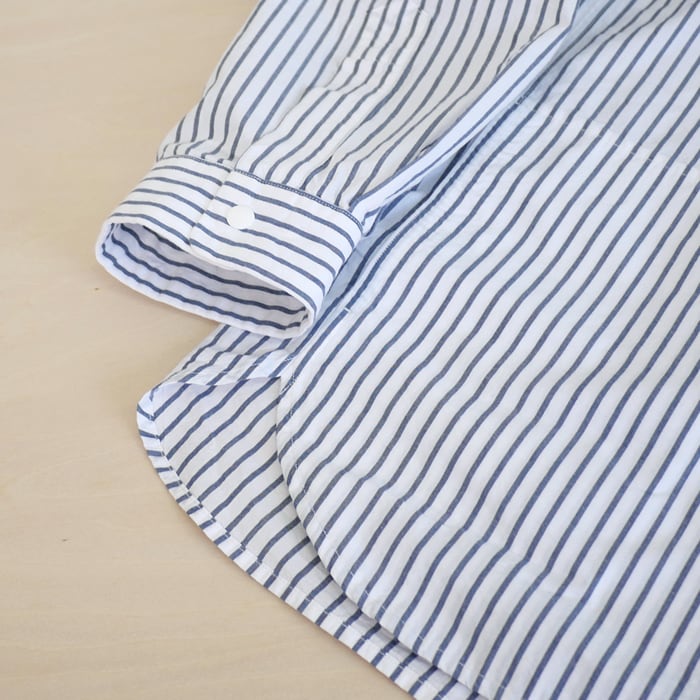 南米ペルーの地で育まれた、短い繊維と程よいムラ感が魅力の綿糸を贅沢に使用した質感が特徴的です。薄手でありながらも凛としたハリを備え、表面にわずかな毛羽立ちを湛えた生地は、通年を通して肌に馴染む豊かな表情を持っています。洗いざらしのような、どこか素朴で温かみのある雰囲気が、装いに奥行きを与えてくれます。