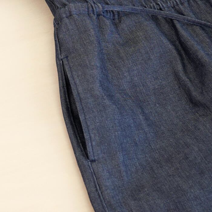 シルエットは、潔いロング丈が描く美しい縦のライン。カジュアルな素材感でありながら、どこか落ち着いた大人の品格を感じさせてくれます。ウエスト部分には繊細なシャーリングギャザーを施し、内蔵された紐でシルエットの調整が可能。お好みの加減でメリハリをつけることで、一着で完成された装いを作り上げます。