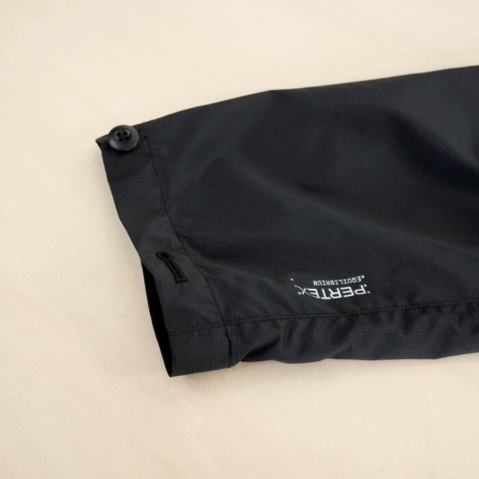 リサイクルナイロン「NetPlus」を用いた、二重織り構造のPERTEX® EQUILIBRIUM素材が特徴。表面には耐久撥水加工を施し、予期せぬ雨にも対応する高い機能性を装備。一方で、肌に触れる裏面は凹凸を持たせることで、汗ばむシーンでも肌離れが良く、程よいストレッチ性が常に快適な着心地を保ちます。軽量でありながら、アクティブな動きに耐えうる強靭さも兼ね備えています。
