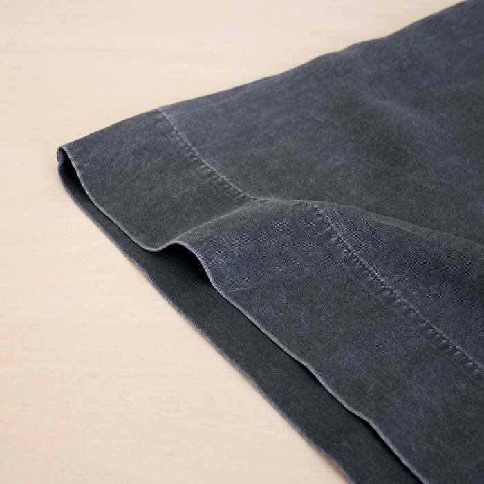 レーヨン100%のギャバジン生地に全面顔料コーティングを施し、製品洗いを加えた特別な素材感が特徴的です。オフホワイトの地色を活かすことで、色落ちやアタリのコントラストが際立ち、新品でありながら長年愛用してきたような奥深い風合いを実現。一点一点異なる個体差があり、まさに古着の一点物と出会うような高揚感を与えてくれます。
