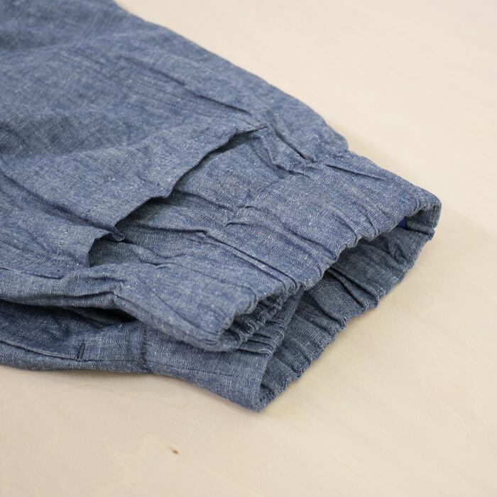 薄手で清涼感のあるダンガリー素材特有の、さらりとした肌触りが特徴的です。デニムのような風合いを持ちながらも、驚くほど軽やかで通気性に優れ、気温の上がる季節でも常に快適な穿き心地をキープ。