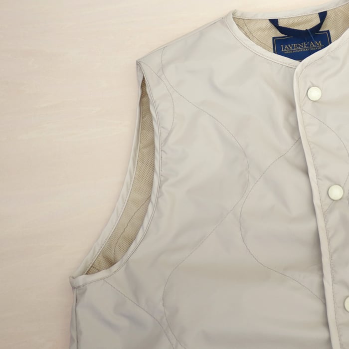 中綿を省き、裏地をメッシュで仕上げた、UNWADDED(アンワデッド)仕様の軽量な質感が特徴的です。表地にはリサイクル・ポリエステル100%のラブンスター生地を使用し、伝統的なホースラグを思わせるキルティングパターンを施しました。ボリュームを抑えた薄手な仕立てのため、シャツやカットソーの上にさらりと羽織るアウターとしてはもちろん、コートの中に忍ばせるインナーとしても、季節を問わずマルチに活躍してくれます。