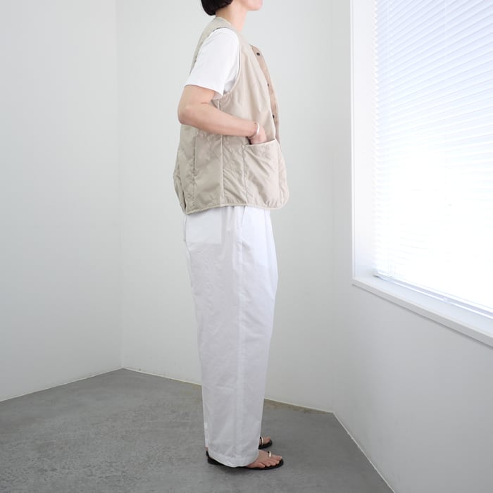 軽やかに重ねて、形を楽しむノーカラーキルティングジレ