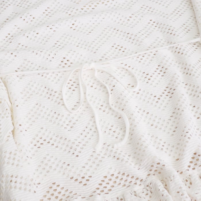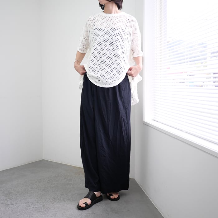 独自の編み組織で表現された、大ぶりで印象的なメッシュ生地が特徴。専用機では難しい大きなメッシュ穴を独自の技術で編み立てることで、まるでカットレースのような繊細な表情を実現しました。一見レースのように見えますが、実はカットソー素材のため、肌当たりが良くご自宅でお手入れしやすいのも日常使いに嬉しいポイントです。