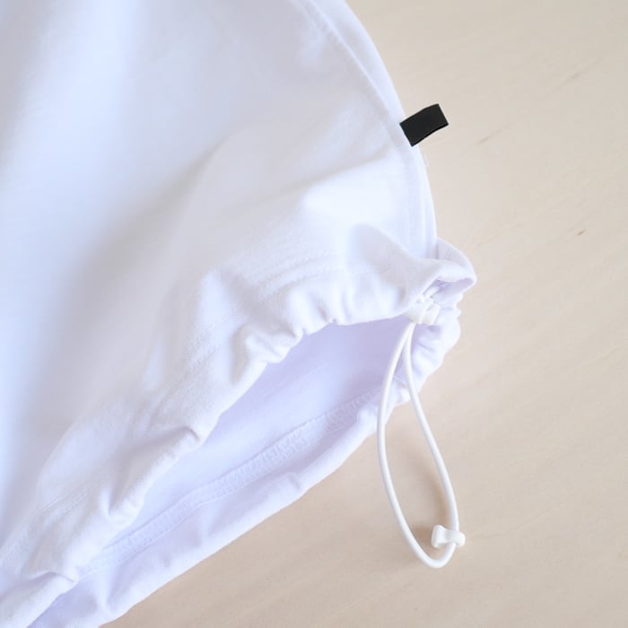 デザインのポイントは、裾にあしらわれたドローコード。そのままストンと着てボックスシルエットを愉しむのはもちろん、コードを絞ることで、バルーンシルエットのような丸みのあるフォルムへと変化させることができます。合わせるボトムスのボリュームに応じて、着こなしのバランスを自由自在にコントロール可能です。