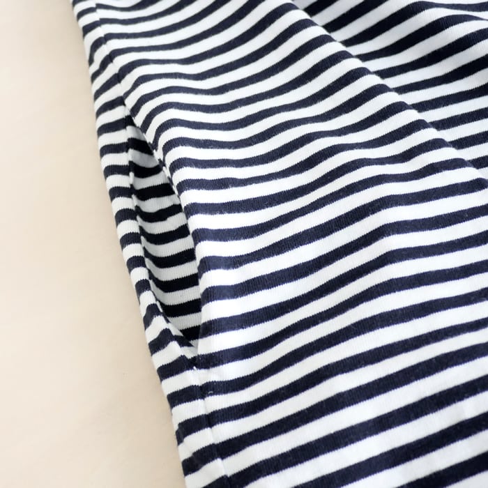 身幅にゆとりを持たせたリラックスシルエットは、窮屈さを感じさせない軽やかな着心地。白とネイビーの絶妙なピッチのボーダーは、カジュアルな中にも爽やかで上品な印象を添えてくれます。Tシャツの良さをそのまま引き伸ばしたような、無駄のないシンプルなデザインは、流行に左右されず長く愛用いただけますよ。