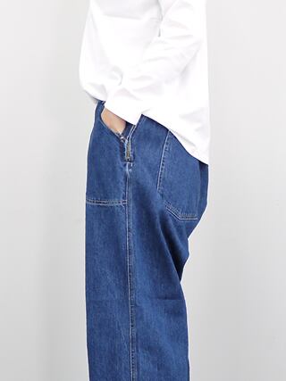 1930年代に牧場観光の際に汚れなどを防ぐために着用されたオーバーパンツをモチーフに、柔らかな穿き心地の程よい厚みの生地を使い作られたランチパンツ。サイドジップとポケット周りのステッチワークが印象的なデザインとなっています。深めの股上と裾に向かって緩くテーパードのかかったシルエットが特徴で、フロント両サイドにはアウトポケット、後ろはパッチポケット付き。