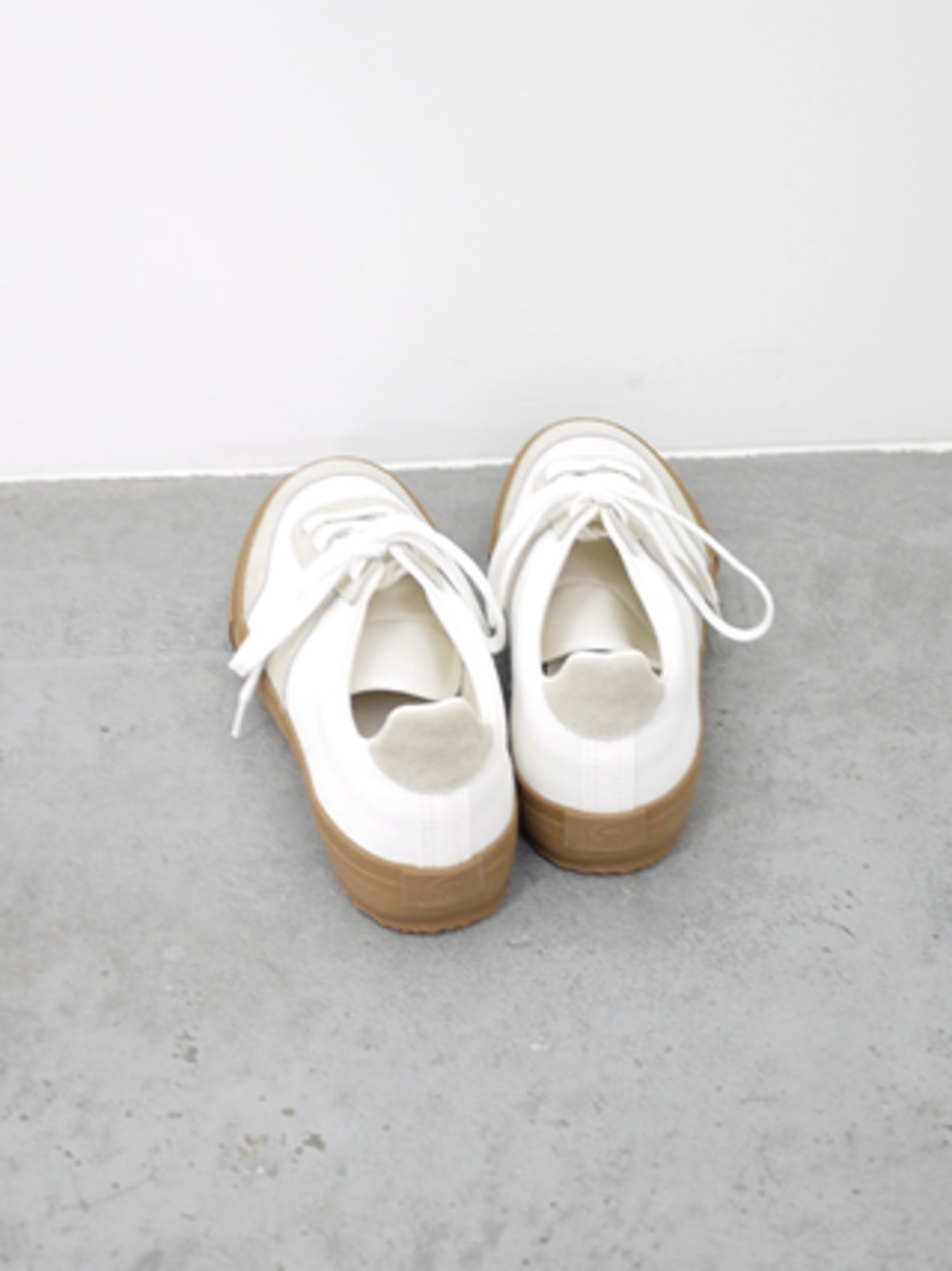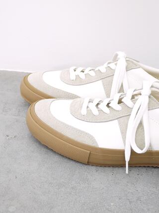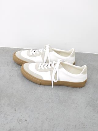 国内でもごく僅かな工場でしか生産することの出来ないヴァルカナイズ製法(加硫製法)のシューズ。この製法から生み出される靴にはソールがしなやかで柔らかい、丈夫で壊れにくい、美しいシルエットが保てるといった良さがあります。こちらは、1970年代に生産していた運動靴をルーツとしたモデル。アッパーはキャンバスをベースに強度が求められる箇所をスウェードレザーで補強しています。オーセンティックなフォルムが魅力的な一足です。