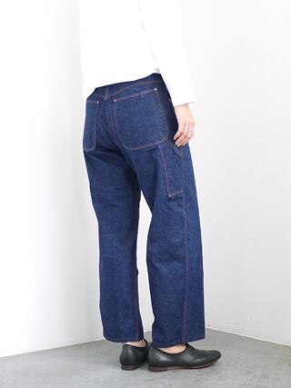 1930年代のペインターパンツをモチーフにデザインされたパンツ。1930年代のパンツの特徴である、後身頃ヨーク部分にはバックル付きベルトを配しています。シルエットは股上深めの太めのストレート。素材にはオアスロウオリジナルの9オンスセルヴィッジデニムを使用しています。オレンジの縫糸が経年変化により退色しピンクになった部分や、ヴィンテージデニム特有の素材感を表現した本格的な一本です。