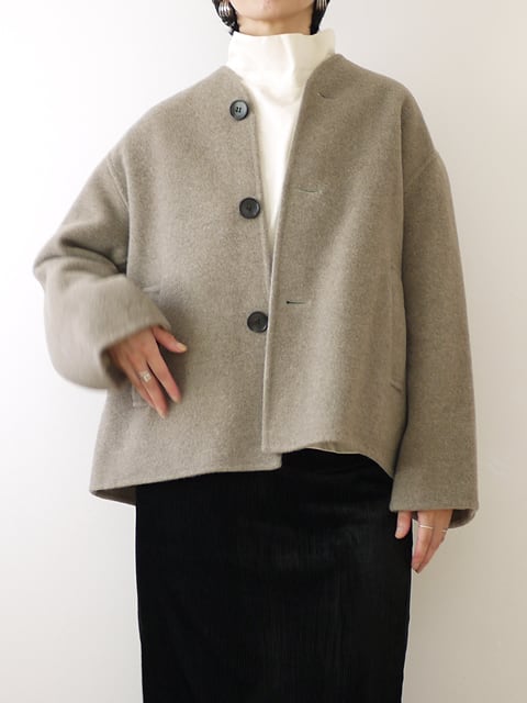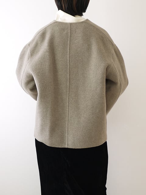 手縫いで縫製されたウールリバージャケット。スーパー100エクストラファインウール原料を使用。ダブルフェイスを両面のモッサ仕上げにしています。長い繊維長の原料を使っているので起毛品でもしっかりとした品位を保ち、柔らかく弾力性のあるのが特徴です。また、メルトン一枚仕立てのジャケットながら、表と裏で表情が違うこだわりの生地を使用しており、あえて裏側をみせて着こなしに奥行きを持たせてみるのもお勧めです。スッキリとしたノーカラーや浅めのVネック、大きめのボタンなど、こだわりの詰まったデザインが上品で知的な印象。カジュアルから綺麗めなスタイルまで幅広いスタイリングに取り入れていただけます。