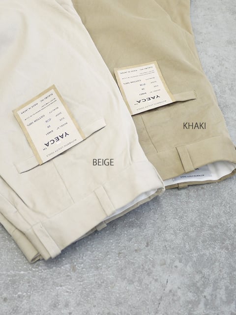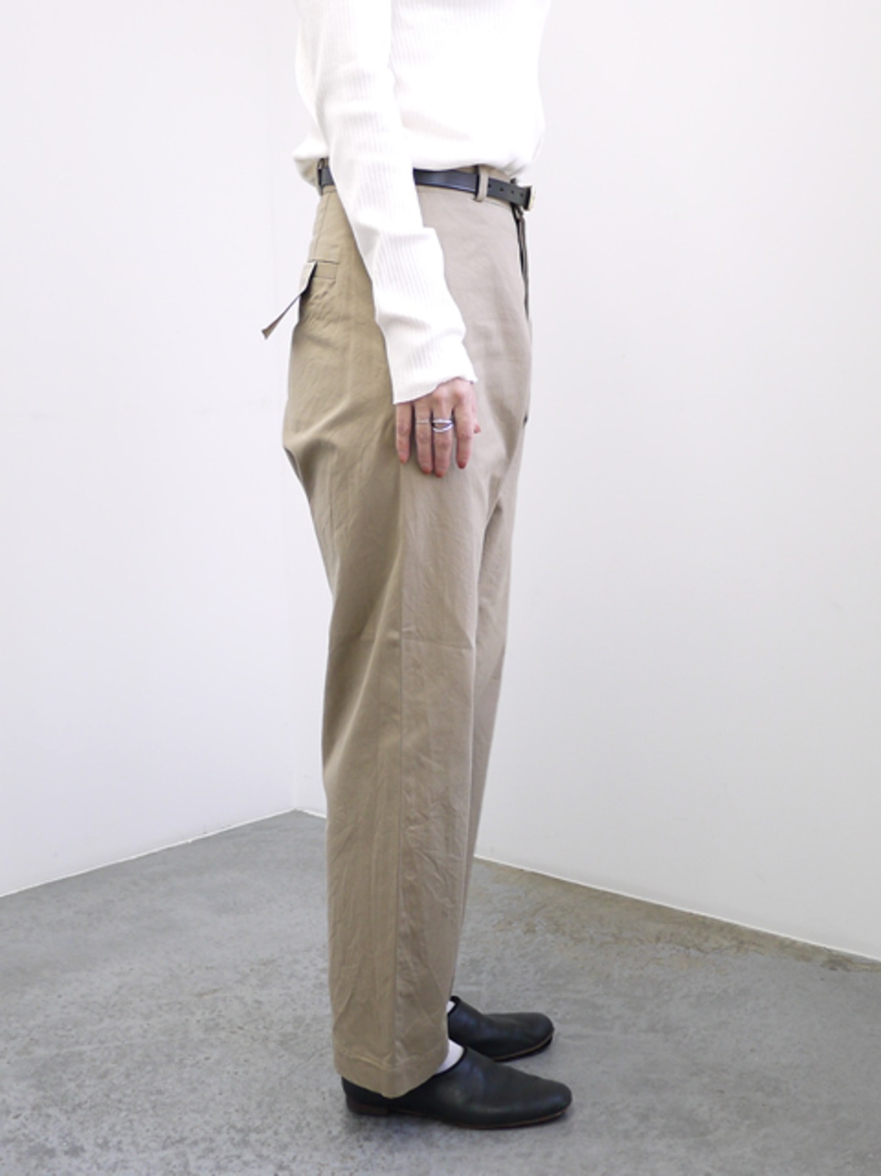 ワイドストレートデザインのチノパンツ。一般的なチノクロスのような単糸ではなく、双糸で高密度に織り上げた生地を使用しています。スラックスを作る時のように丁寧に仕立てられた生地は、軽くてしなやか。上品な履き心地ながら、しっかりと頼りがいのある定番のパンツです。股上も深く、腰まわりは程よくゆったり。すっきりとした印象のワイドフォルムです。
