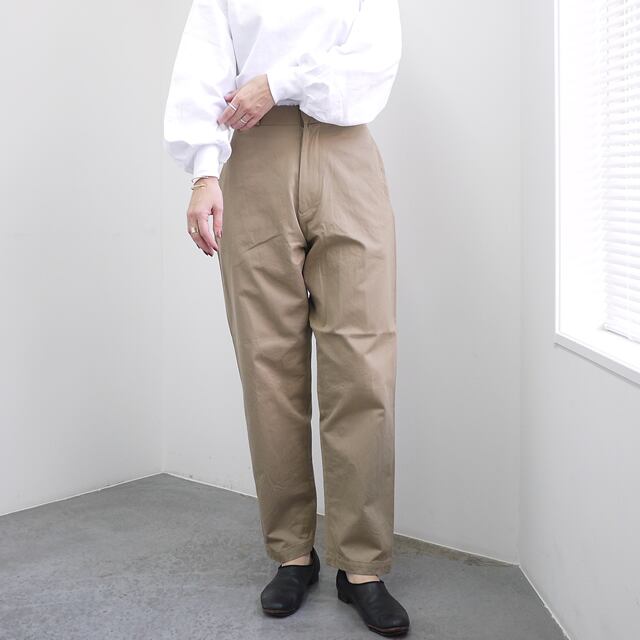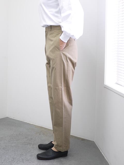 テーパードデザインのチノパンツ。一般的なチノクロスのような単糸ではなく、双糸で高密度に織り上げた生地を使用しています。スラックスを作る時のように丁寧に仕立てられた生地は、軽くてしなやか。上品な履き心地ながら、しっかりと頼りがいのある定番のパンツです。股上も深く、腰まわりは程よくゆったり。程よくワイドですっきりとした印象のチノテーパードパンツです。