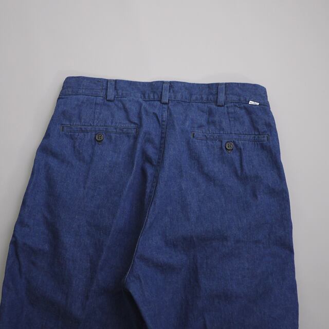 薄手のインディゴ生地を使用したワイドデニムパンツ。ワイドなシルエットと、フロントに入れられた2本のタックが特徴です。腰回りはゆったりと、裾に向かって緩やかなテーパードのラインで、リラックスして履けるデザイン。生地は洗いのかかった8オンスのワンウォッシュデニム。穿き始めから馴染んだ様な着心地のよさが印象的です。