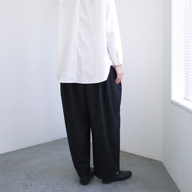 4WAYストレッチの穿き心地の良いサイドドレープワイドパンツ。ライトウエイトなTRストレッチ素材を使用、シーズンレスでお使いいただける素材です。滑らかで落ち感のある上品な生地感が特徴。デザインはサイドタックを施したシルエットで、ドレープ感があり落ち感のあるシルエットを表現。シーンを選ばず活躍するスタイリッシュな一着です。サイドポケットなし。
