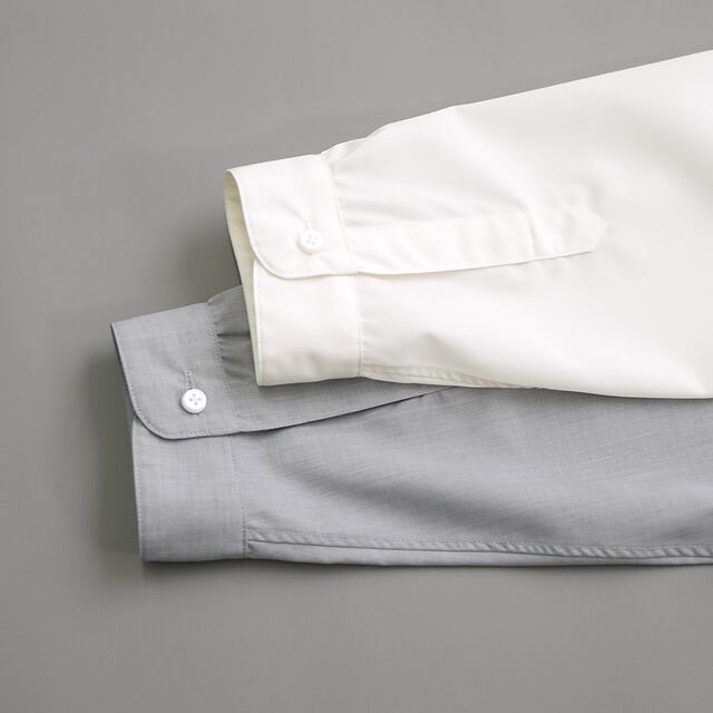 経糸緯糸共に50番単糸のポリエステルとレーヨンの混紡コンパクト糸を使用して平織で織ったブロード生地を使用。肩や首元はすっきりとした印象に、身幅にはややゆとり感もある定番デザインのノーカラーシャツ。しわにもなりにくく、通年で着用できる一着です。