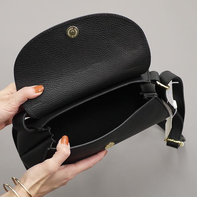 上品な天然皮革のレザーが上質感溢れるコンパクトなショルダーバッグ。特徴的な丸みを帯びたデザインは小さなサイズ感でありながらマチがしっかりあるので、財布やスマートフォンなど、最低限必要なものを十分に収納することが出来ます。マグネットで開け閉め出来るミニマムな仕様、また内側にはポケットが付いています。普段使いからフォーマルシーンまで幅広いスタイルでお使いいただけるショルダーバッグです。